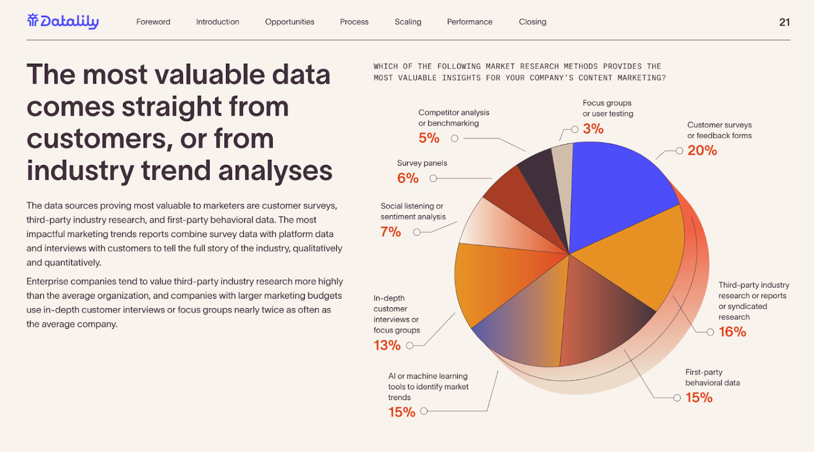 In the Datalily State of Data-Driven Content Marketing report, we used a pie chart to show the breakdown of a survey question where respondents had to choose one answer.