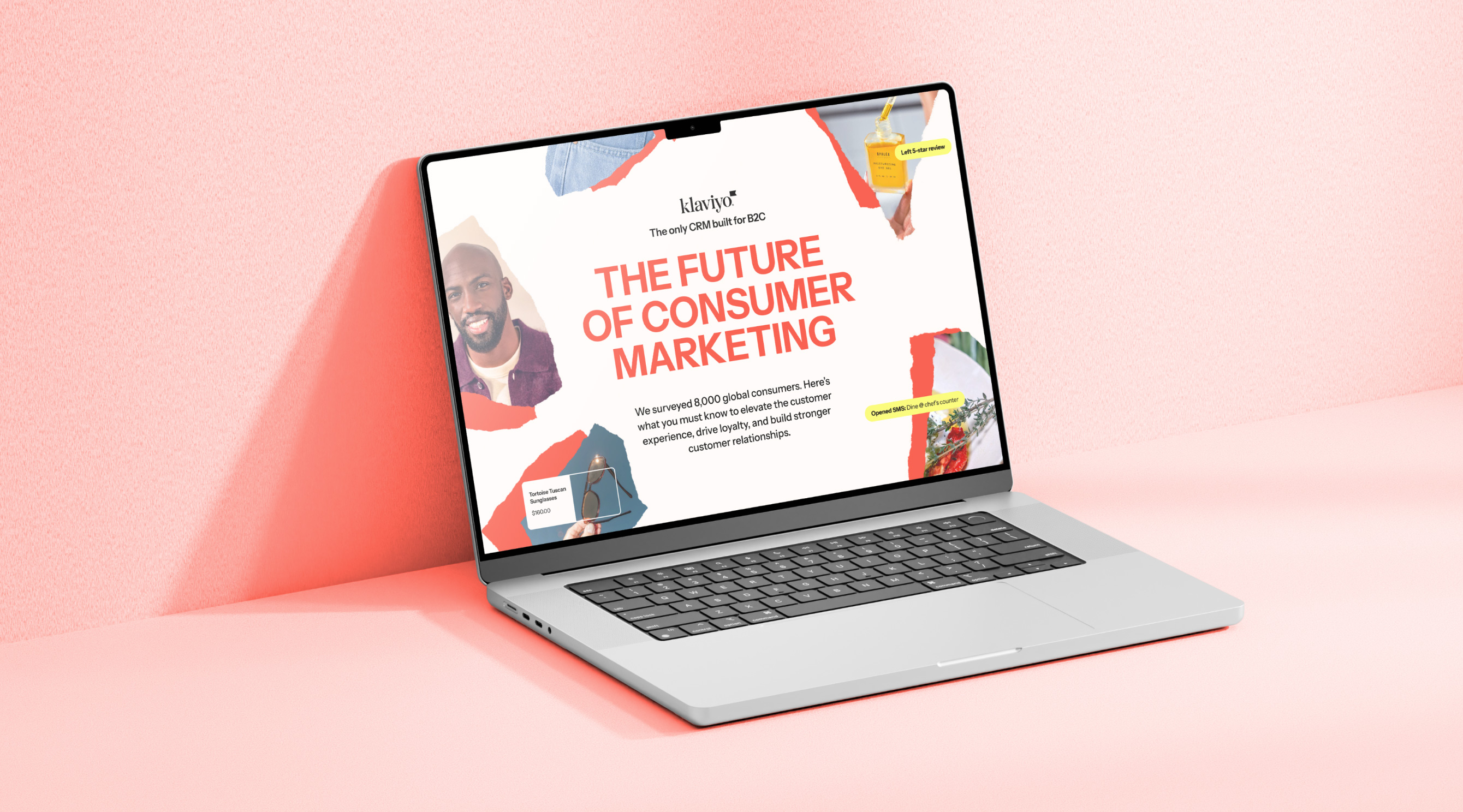 After the strategy process, we fielded the survey and gathered data from 8,000+ consumers across 13 countries in three regions — North America, Europe, and Asia Pacific. Then, we created a detailed data analysis that the Klaviyo team began using right away to create sales enablement materials like one pagers, campaign and performance content, and product marketing materials. Finally, we produced an industry trends report that incorporated the data and insights from the research along with actionable takeaways for the B2C audience Klaviyo wanted to reach.